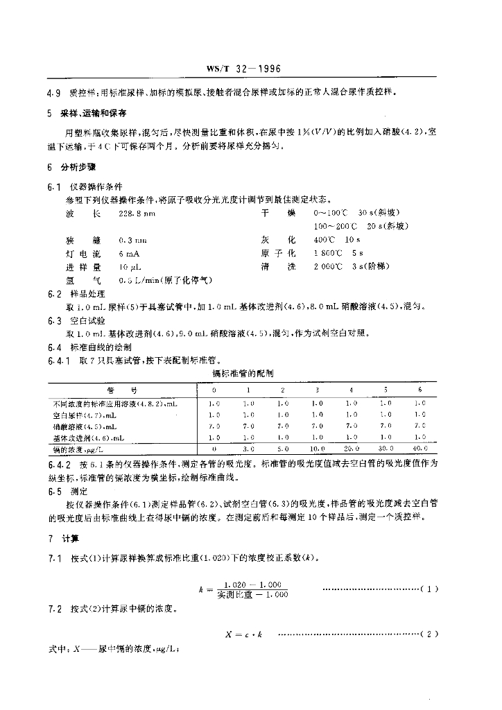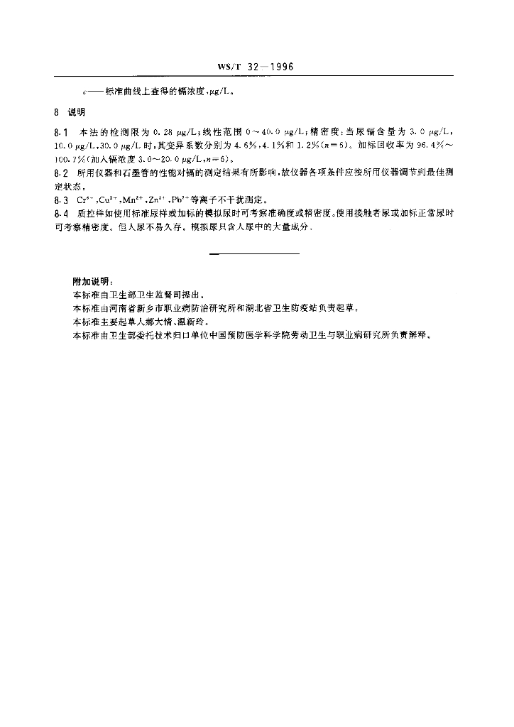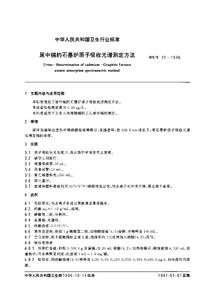 WS/T 32-1996 尿中镉的石墨炉原子吸收光谱测定方法