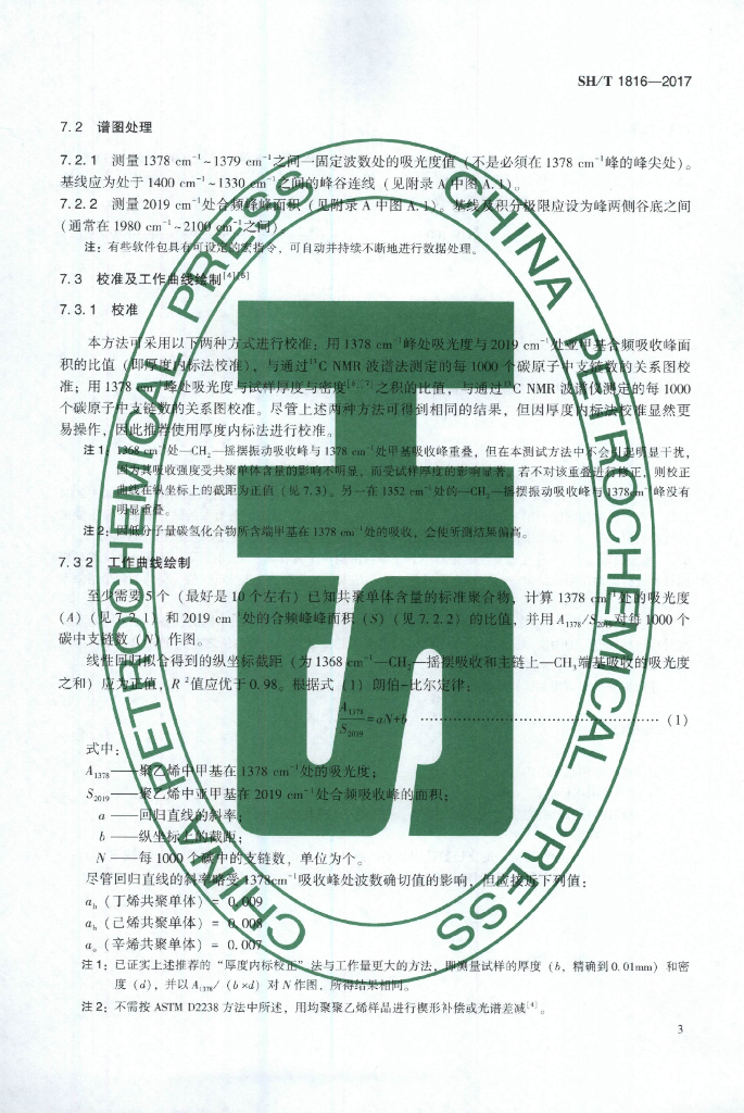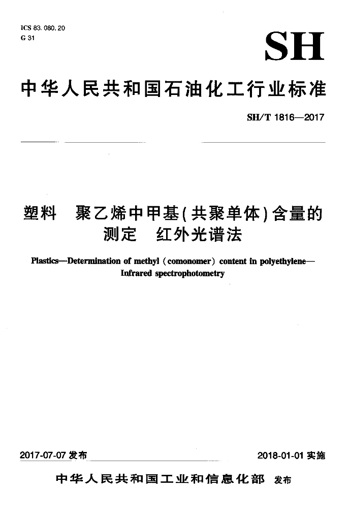 SH/T 1816-2017 塑料 聚乙烯中甲基(共聚单体)含量的测定 红外光谱法