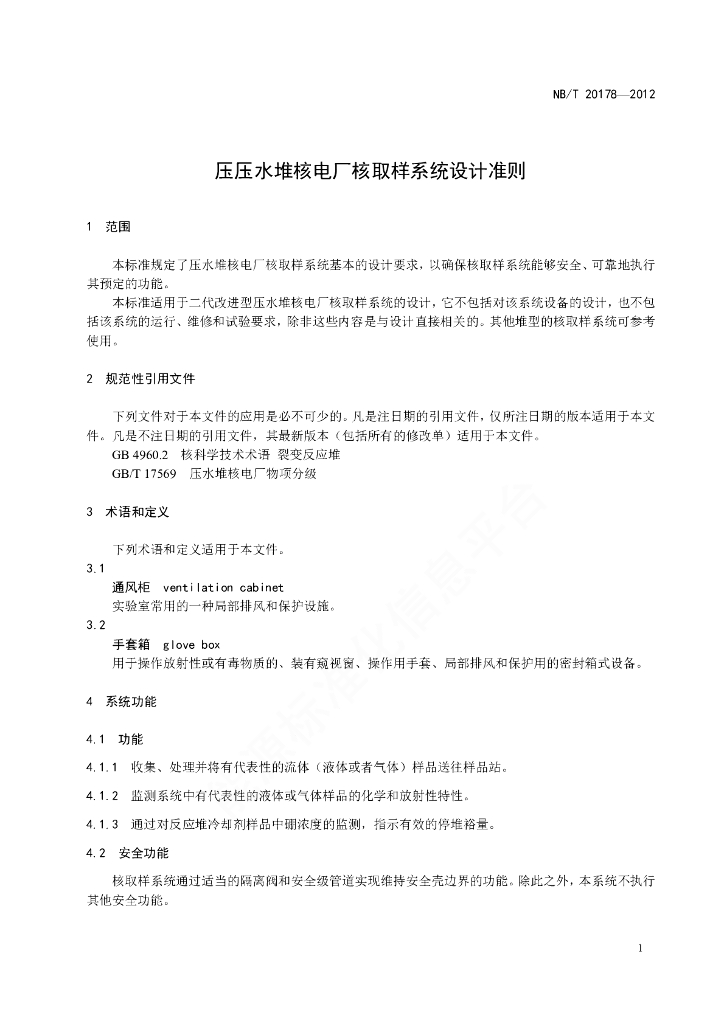 NB/T 20178-2012 压水堆核电厂核取样系统设计准则