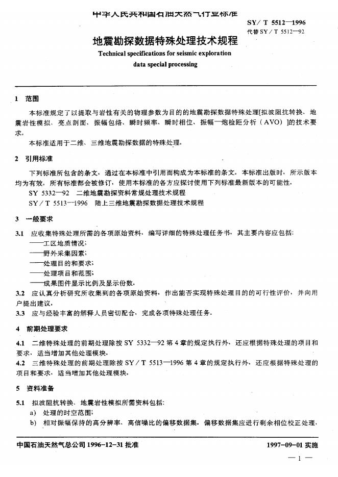 SY/T 5512-1992 地震勘探资料特殊处理技术规程