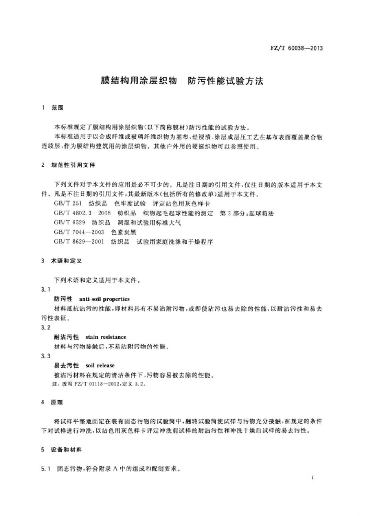 FZ/T 60038-2013 膜结构用涂层织物防污性 能试验方法