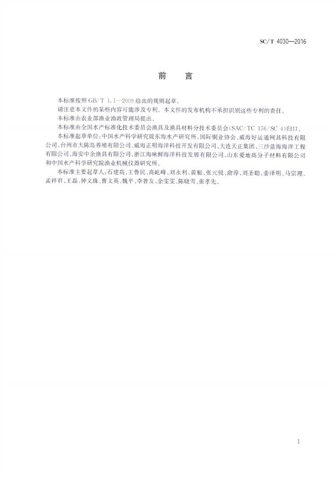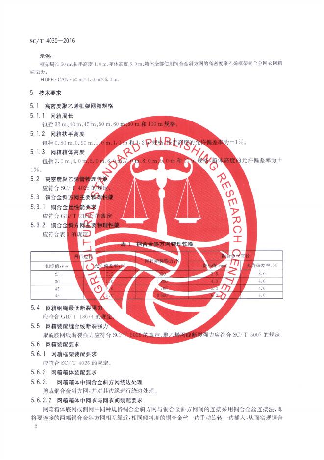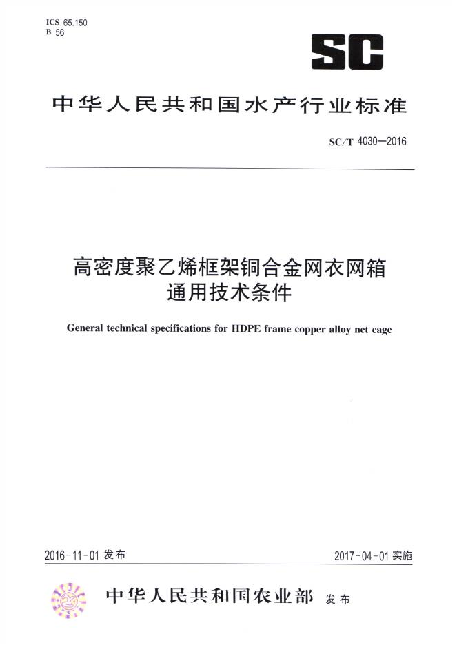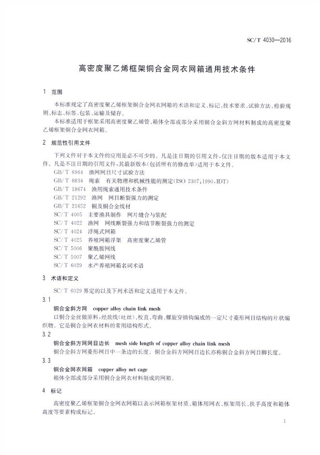 SC/T 4030-2016 高密度聚乙烯框架铜合金网衣网箱通用技术条件