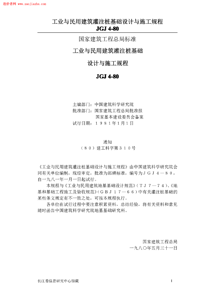 JGJ 4-1980 工业与民用建筑灌注桩基础设计与施工规程