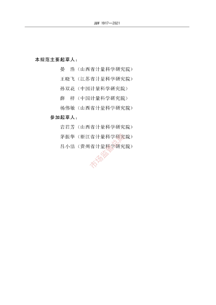 晏浩(山西省计量科学研究院)、王晓飞(江苏省计量科学研究院)、孙双花(中国计量科学研究院)、薛梓(中国计量科学研究院)、杨伟敏(山西省计量科学研究院)、岩君芳(山西省计量科学研究院)、茅振华(浙江省计量科学研究院)、吕小洁(贵州省计量科学研究院)