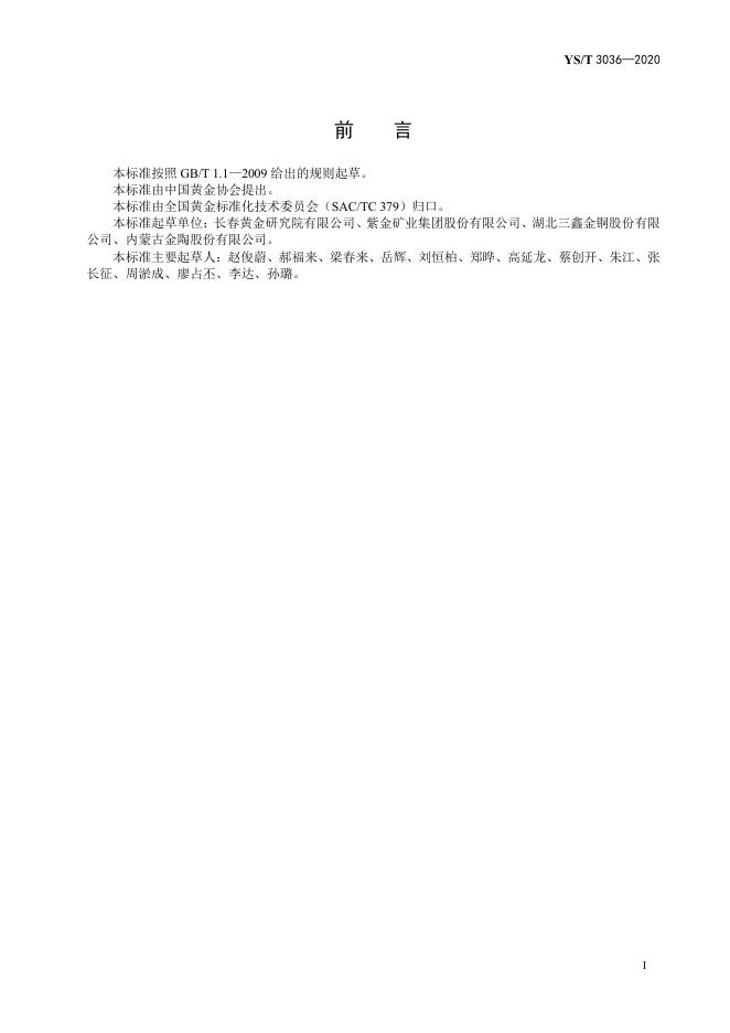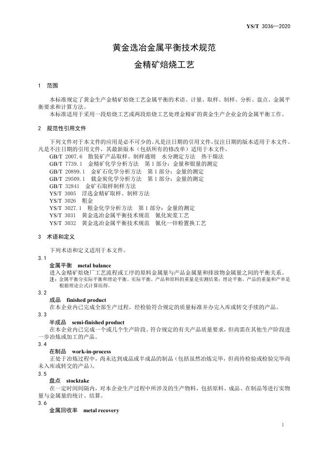 YS/T 3036-2020 黄金选冶金属平衡技术规范 金精矿焙烧工艺