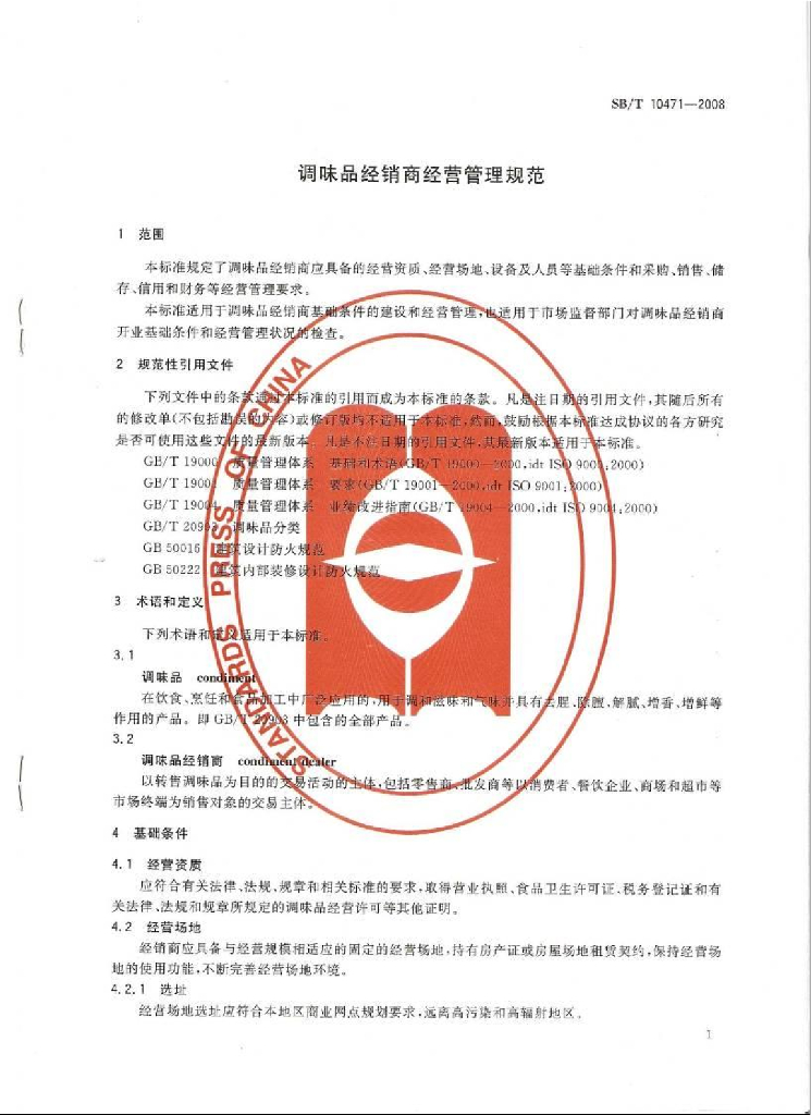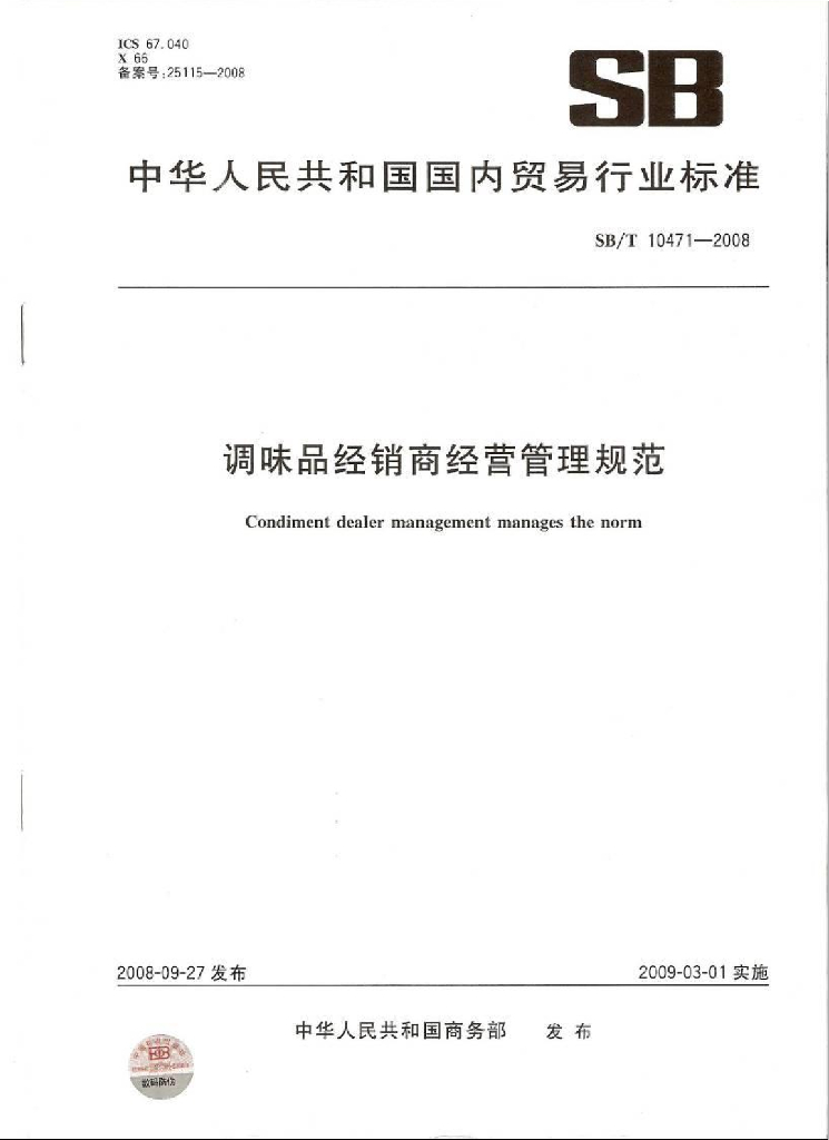 SB/T 10471-2008 调味品经销商经营管理规范