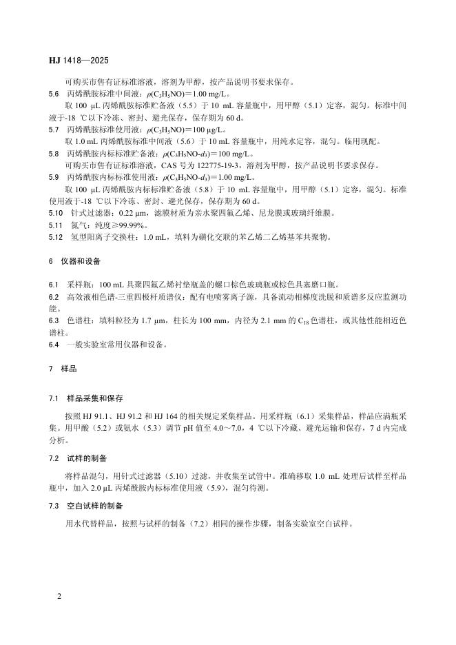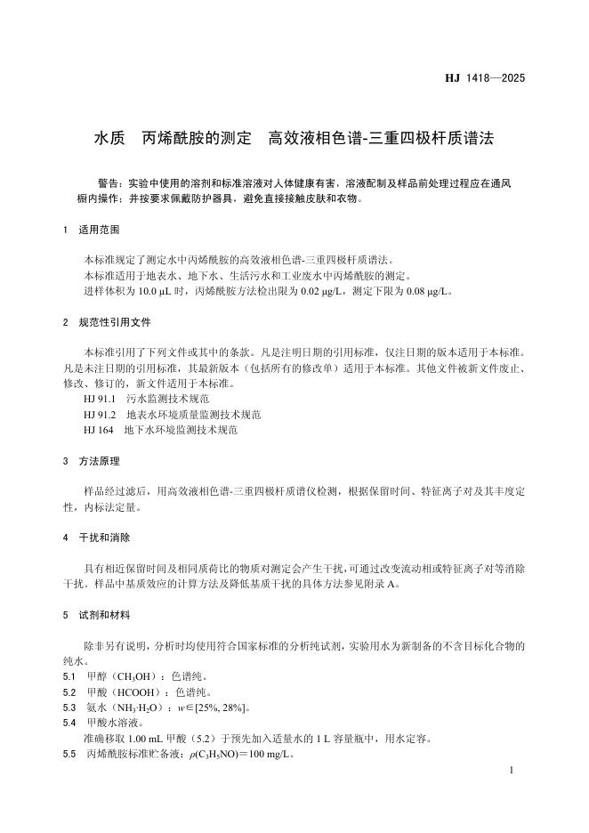 HJ 1418-2025 水质 丙烯酰胺的测定 高效液相色谱-三重四极杆质谱法