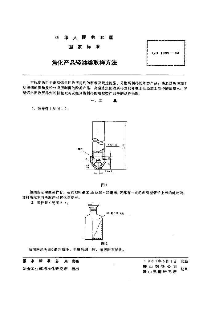GB/T 1999-1980 焦化产品轻油类取样方法