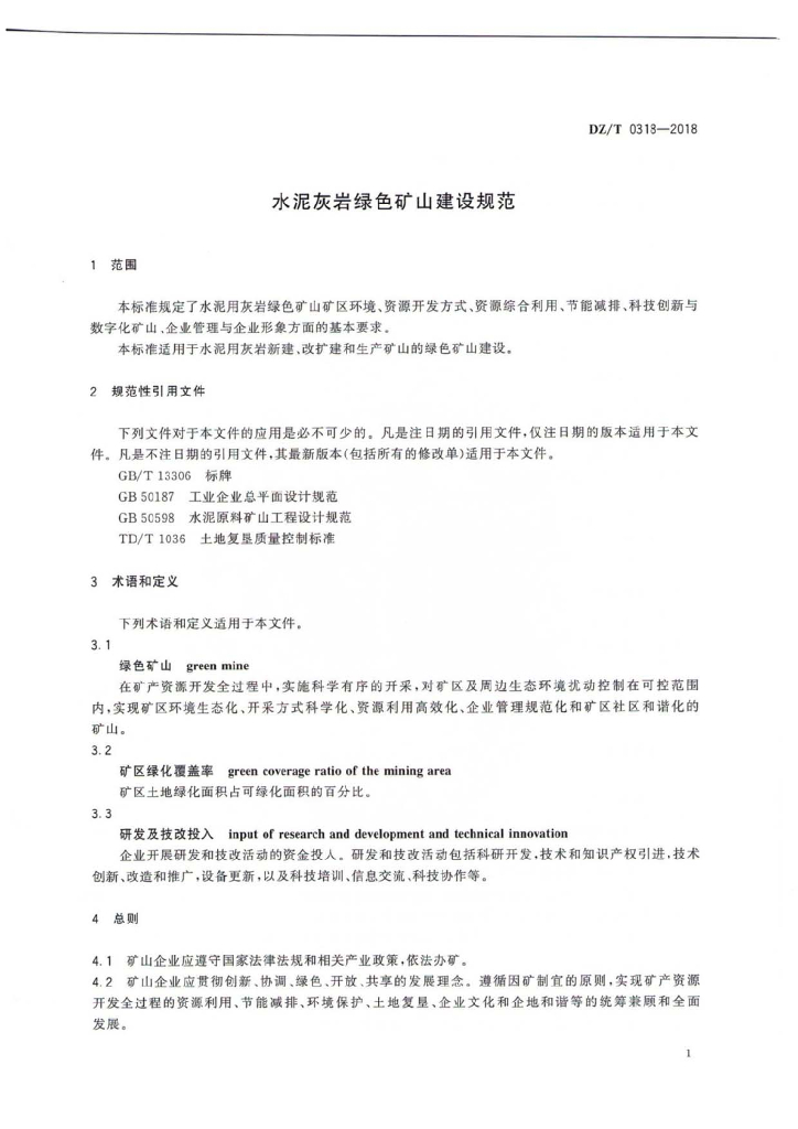 DZ/T 0318-2018 水泥灰岩绿色矿山建设规范