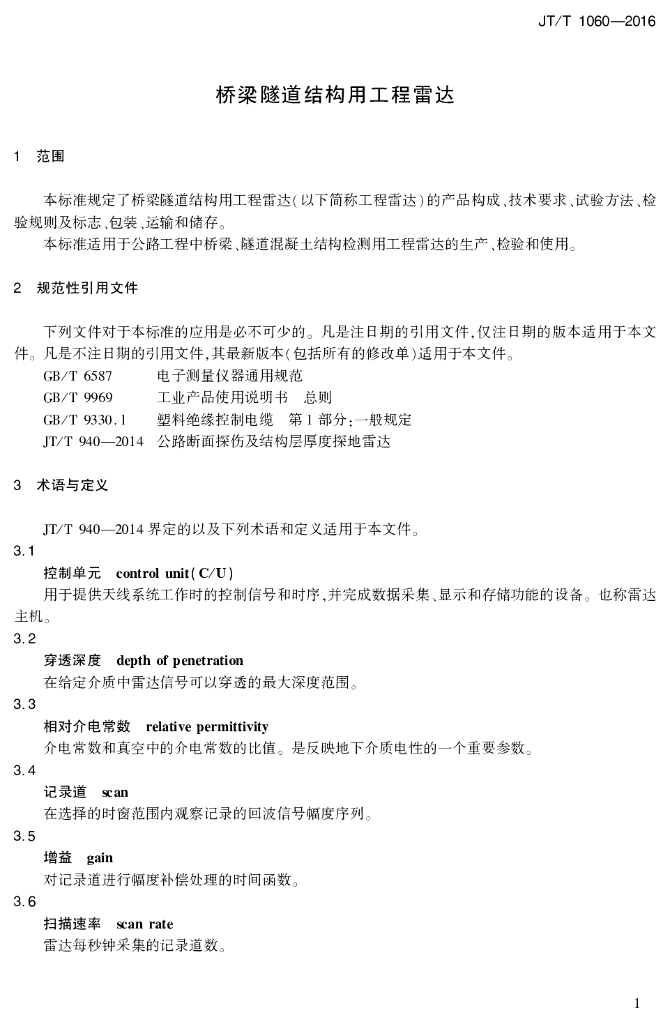 JT/T 1060-2016 桥梁隧道结构用工程雷达