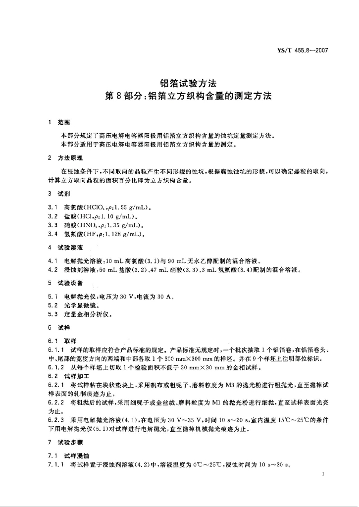 YS/T 455.8-2007 铝箔试验方法 第8部分:铝箔立方织构含量的测定方法