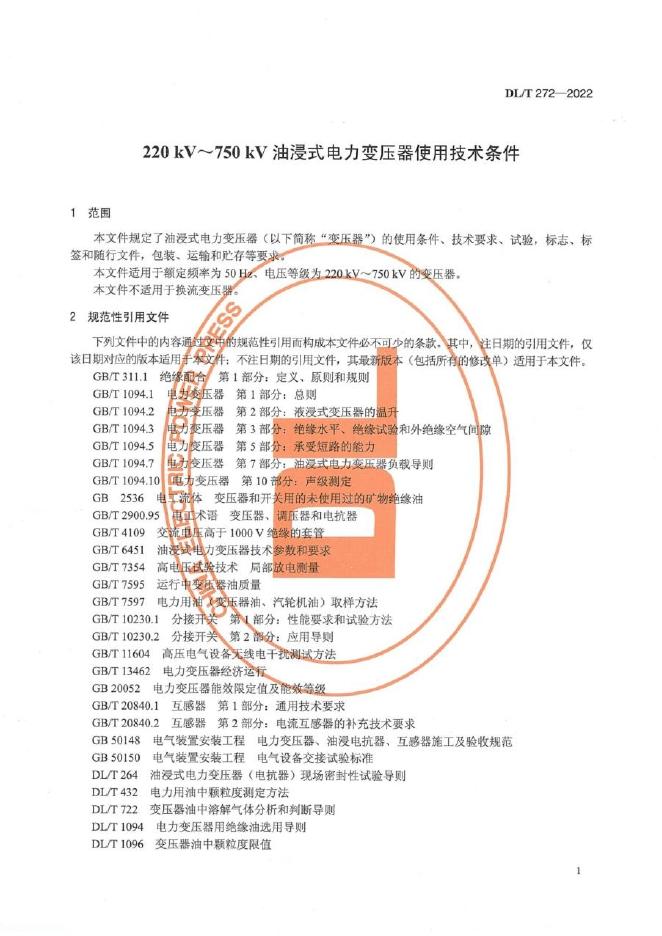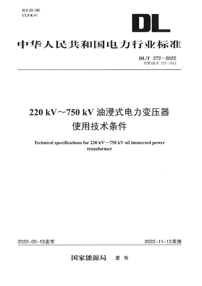 DL/T 272-2022 220kV~750kV油浸式电力变压器使用技术条件
