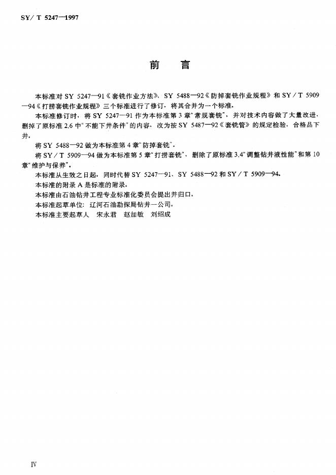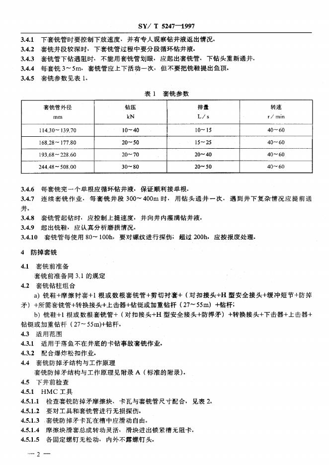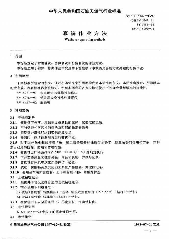 SY/T 5909-1994 打捞套铣作业规程