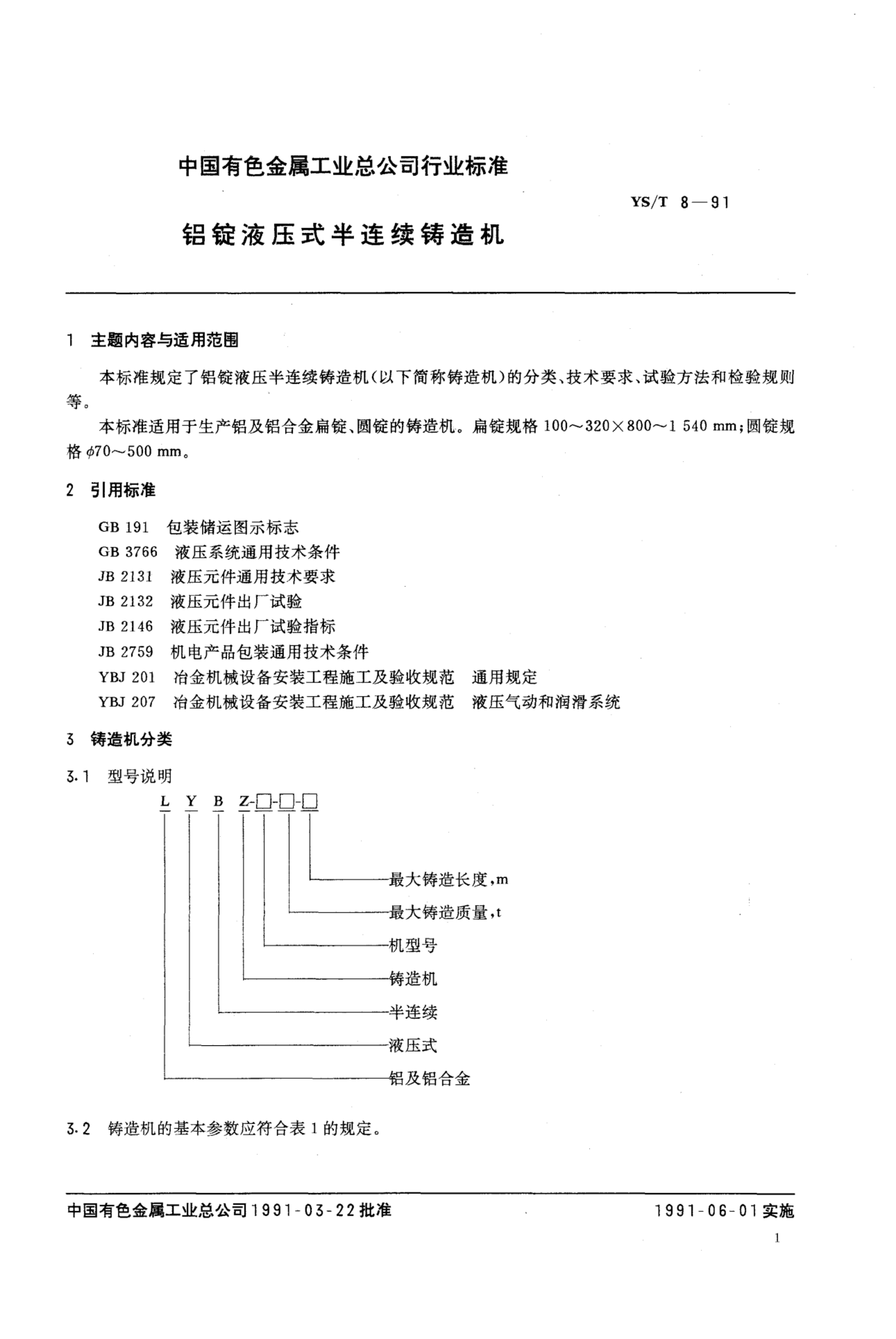 YS/T 8-1991 铝锭液压式半连续铸造机