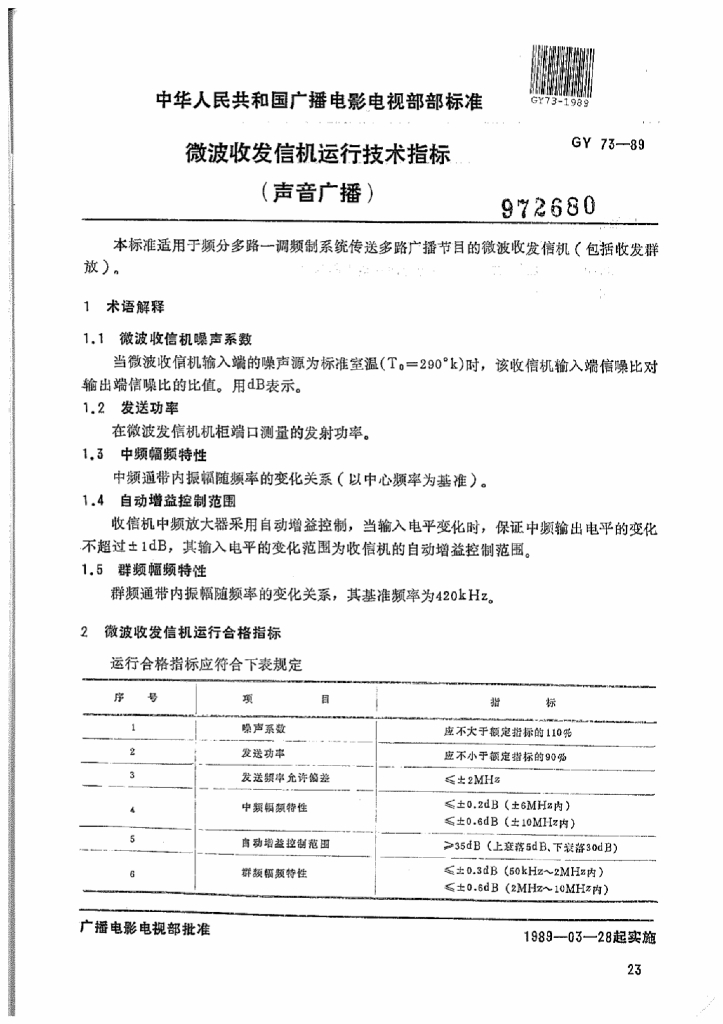 GY 73-1989 微波收发信机运行技术指标(声音广播)