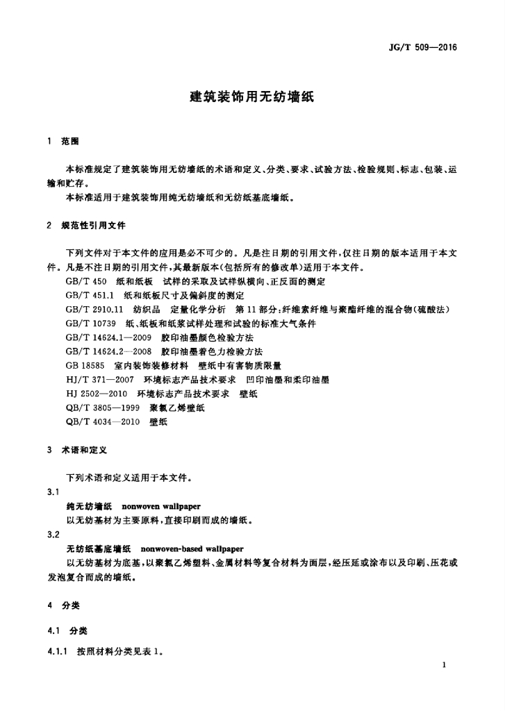 JG/T 509-2016 建筑装饰用无纺墙纸