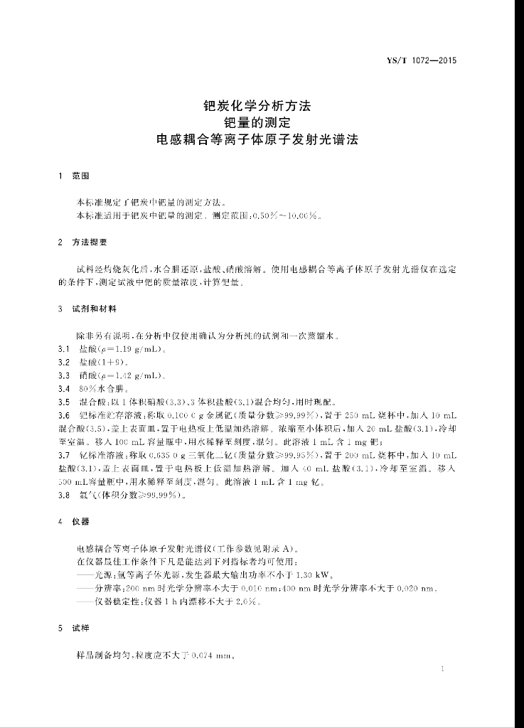 YS/T 1072-2015 钯炭化学分析方法 钯量的测定 电感耦合等离子体原子发射光谱法