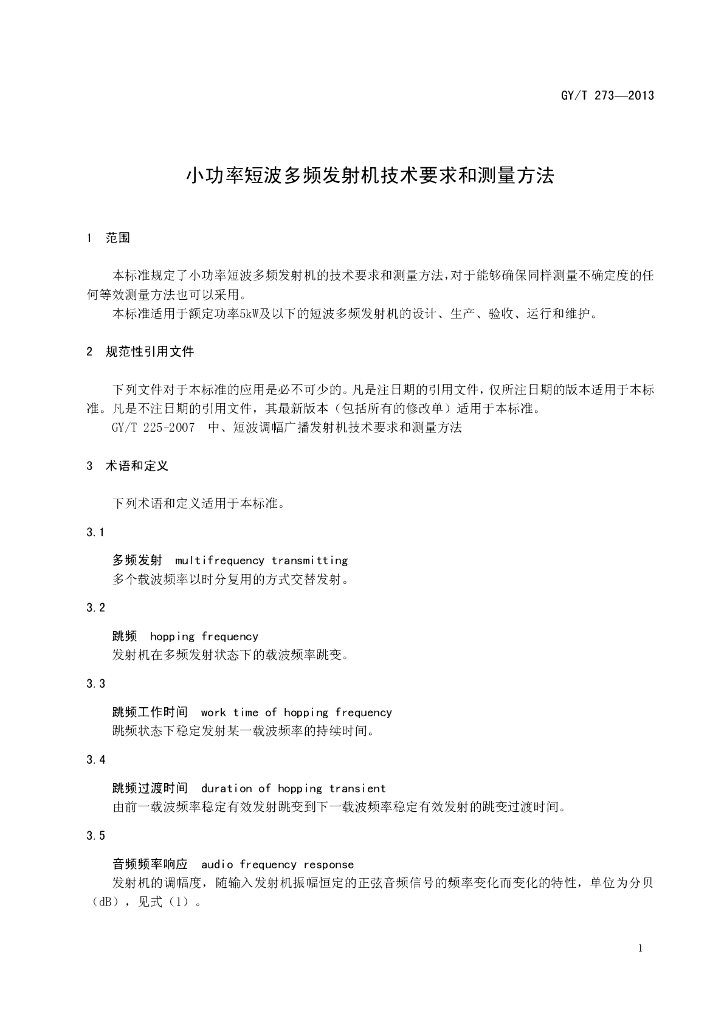 GY/T 273-2013 小功率短波多频发射机技术要求和测量方法