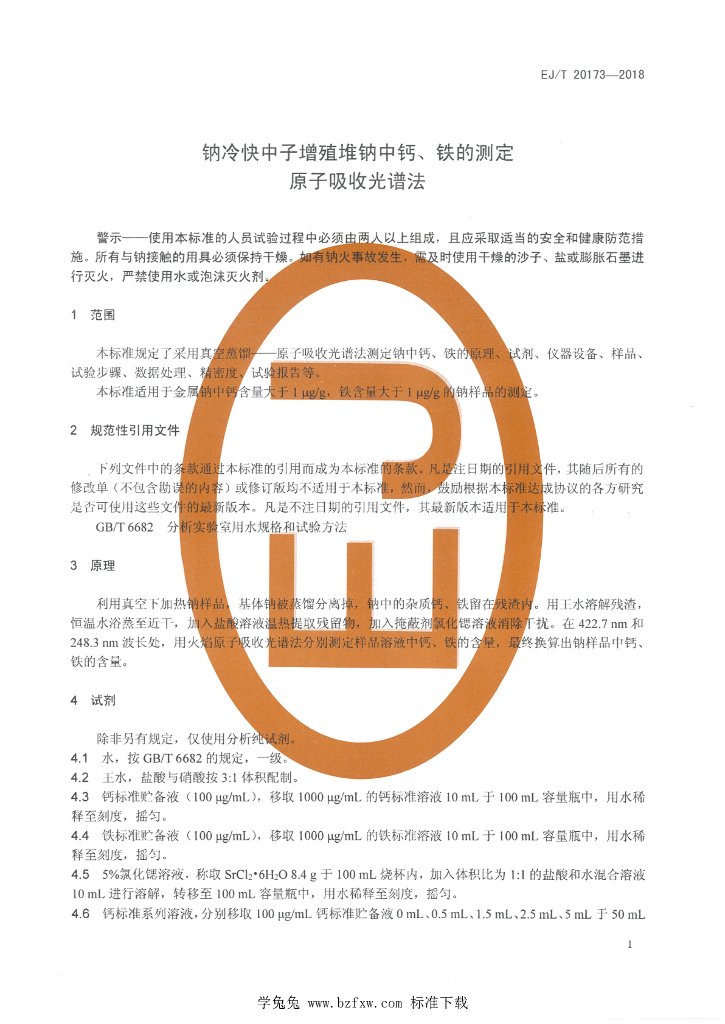 EJ/T 20173-2018 钠冷快中子增殖堆钠中钙、铁测定 原子吸收光谱法