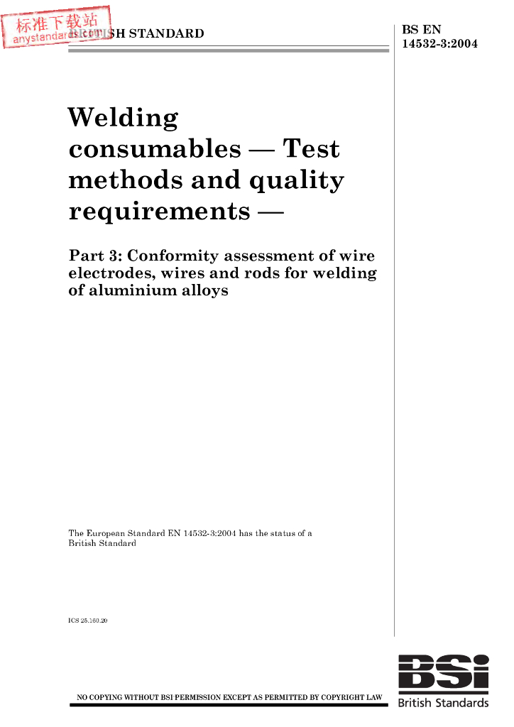 BS EN 14532-3-2004 焊接消耗品.试验方法和质量要求.铝合金焊接用焊丝电极、焊丝和焊棒的合格评定
