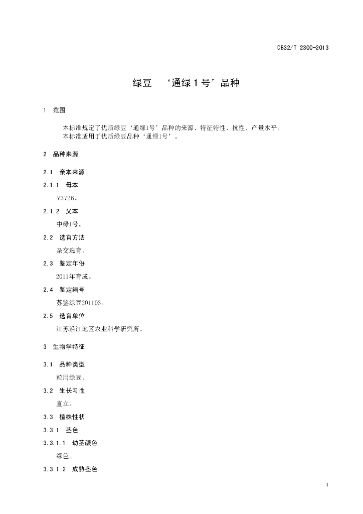 DB32/T 2300-2013 绿豆 ‘通绿1 号’品种