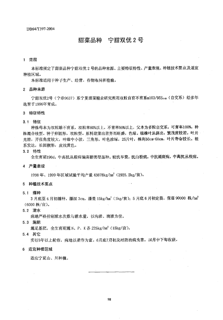 DB64/T 397-2004 甜菜品种 宁甜双优2号