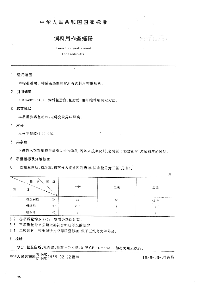 NY/T 137-1989 饲料用柞蚕蛹粉