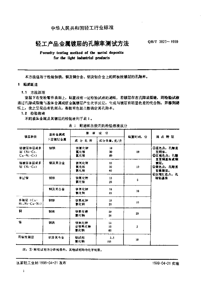 QB/T 3823-1999 轻工产品金属镀层的孔隙率测试方法