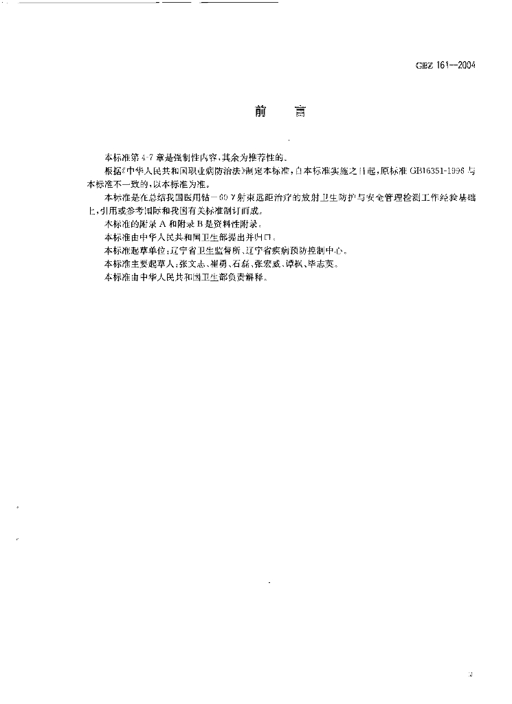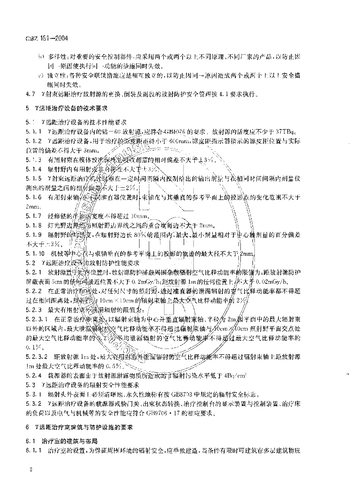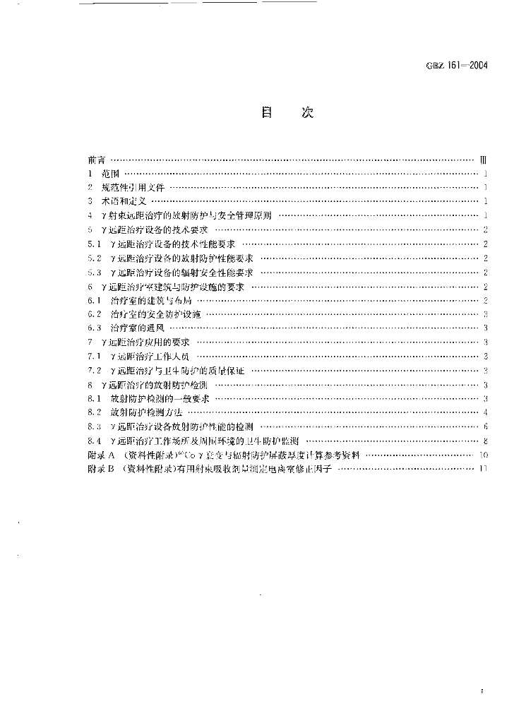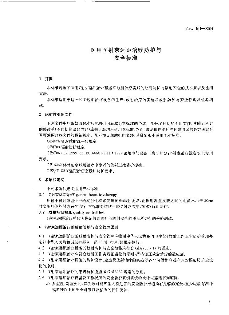 GBZ 161-2004 医用γ射束远距治疗防护与安全标准