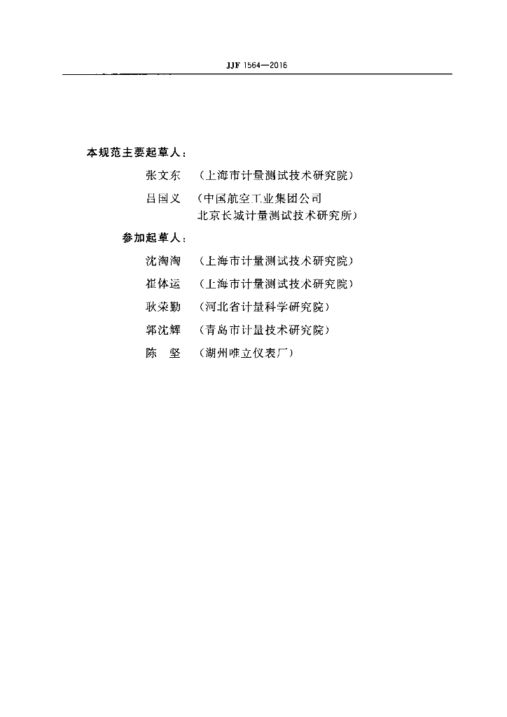 张文东(上海市计量测试技术研究院)、吕国义(中国航空工业集团公司北京长城计量测试技术研究所)、沈淘淘(上海市计量测试技术研究院)、崔体运(上海市计量测试技术研究院)、耿荣勤(河北省计量科学研究院)、郭沈辉(青岛市计量技术研究院)、陈坚(湖州唯立仪表厂)