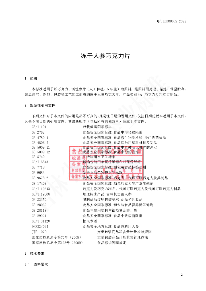 Q/JLBD 0008S-2022 冻干人参巧克力片