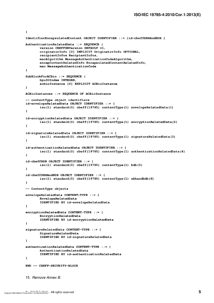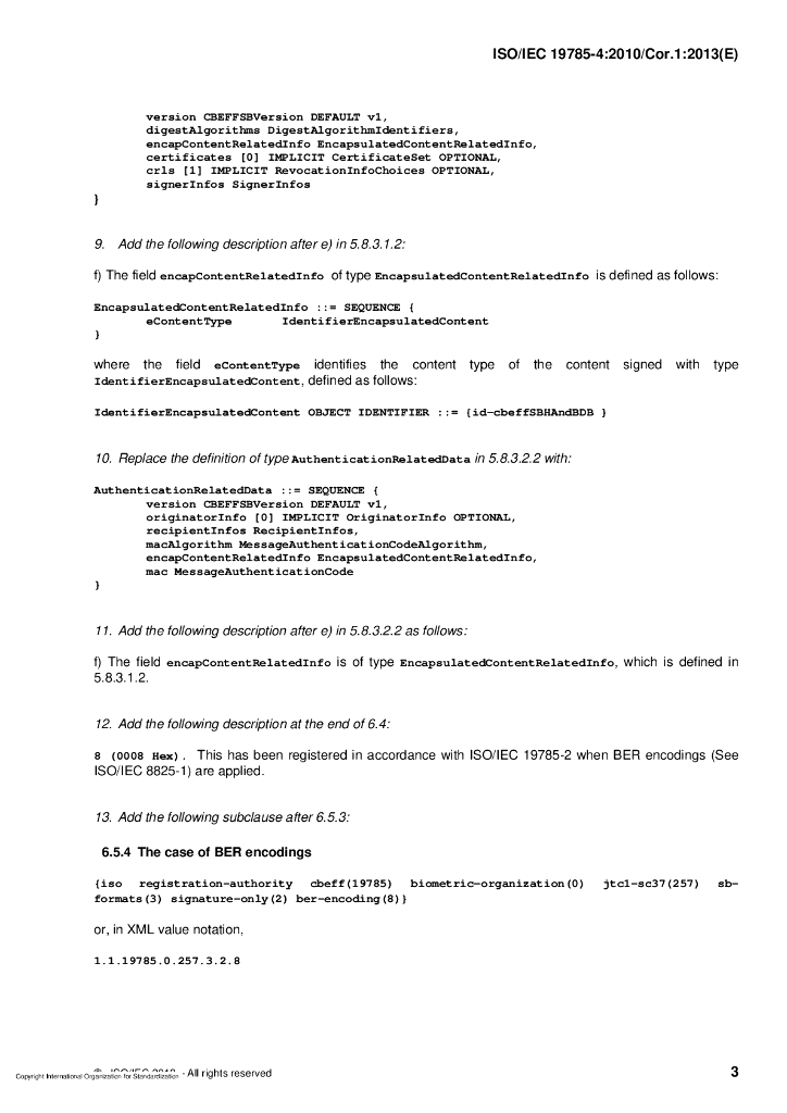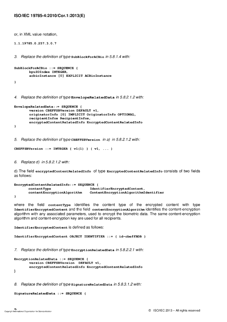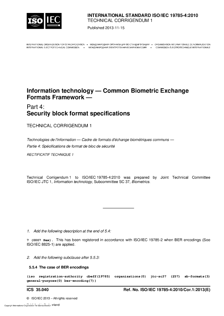 ISO/IEC 19785-4-2010/Cor 1-2013 勘误1:信息技术 生物特征识别交换格式框架 第4部分:安全块格式规范