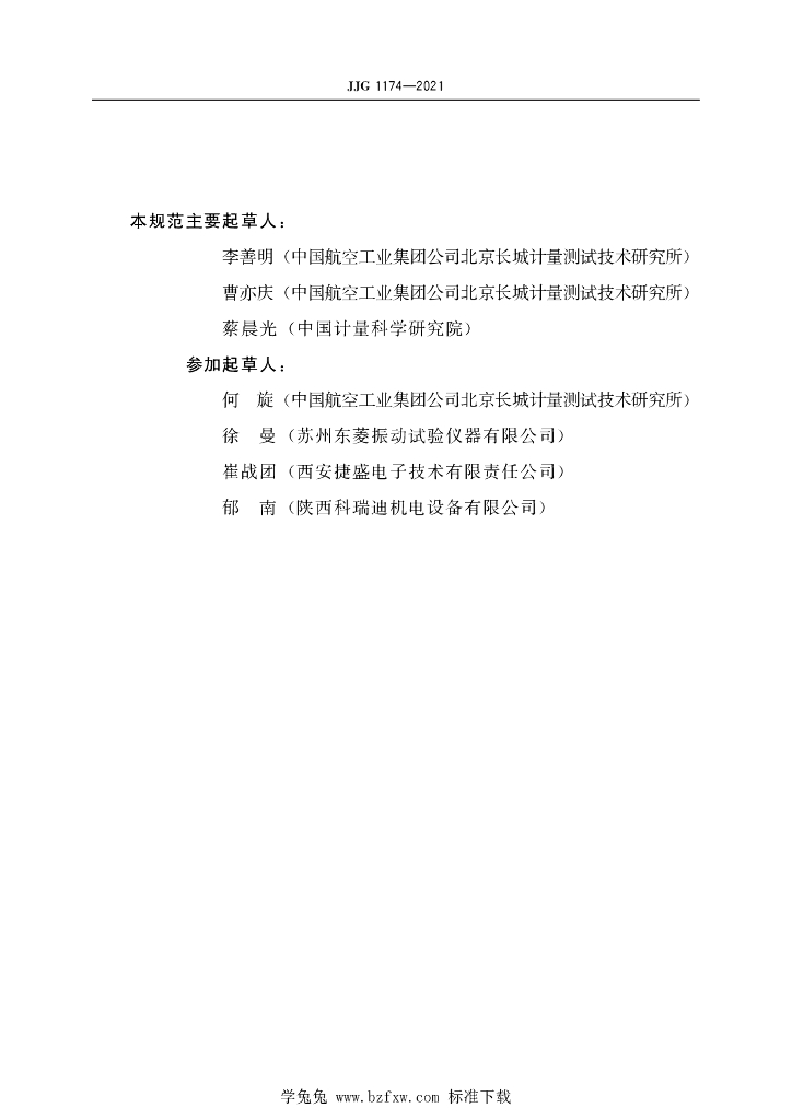 李善明(中国航空工业集团公司北京长城计量测试技术研究所)、曹亦庆(中国航空工业集团公司北京长城计量测试技术研究所)、蔡晨光(中国计量科学研究院)、何旋(中国航空工业集团公司北京长城计量测试技术研究所)、徐曼(苏州东菱振动试验仪器有限公司)、崔战团(西安捷盛电子技术有限责任公司)、郁南(陕西科瑞迪机电设备有限公司)