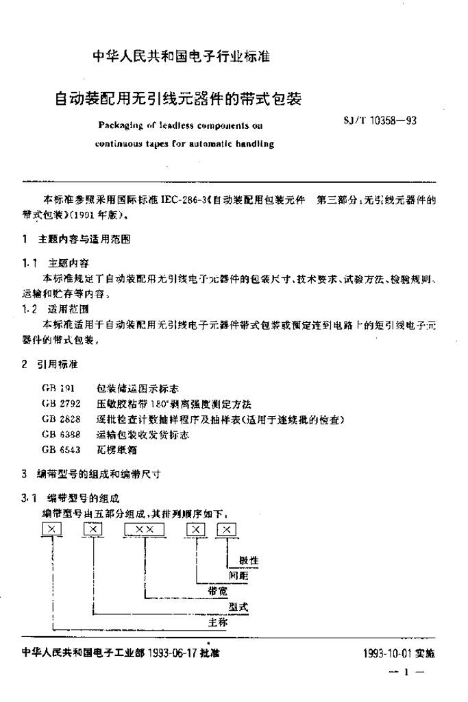 SJ/T 10358-1993 自动装配用无引线元器件的带式包装
