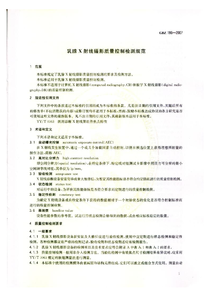 GBZ 186-2007 乳腺x射线摄影质量控制检测规范