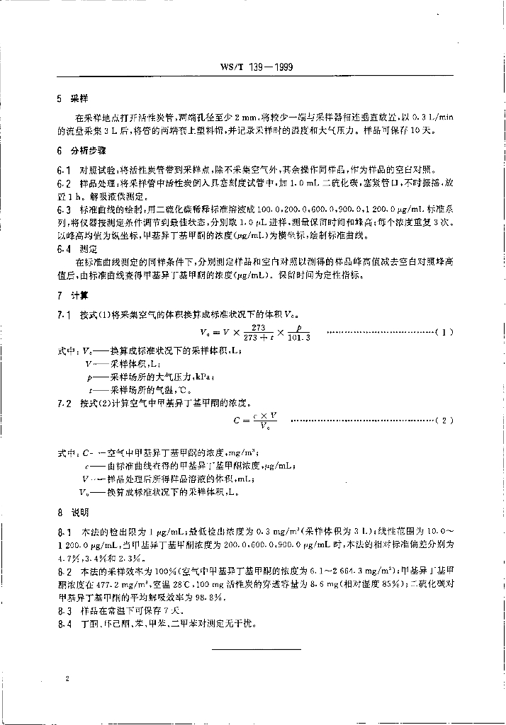 WS/T 139-1999 作业场所空气中甲基异丁基甲酮的溶剂解吸气相色谱测定方法