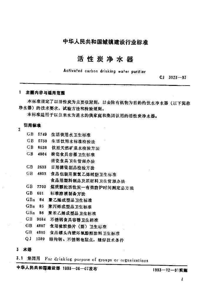 CJ 3023-1993 活性炭净水器