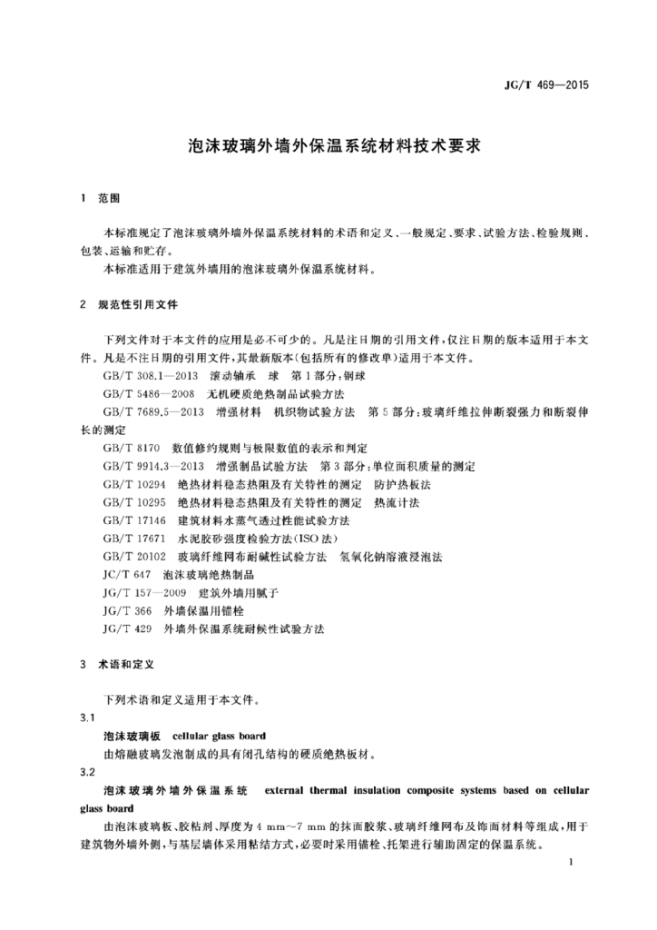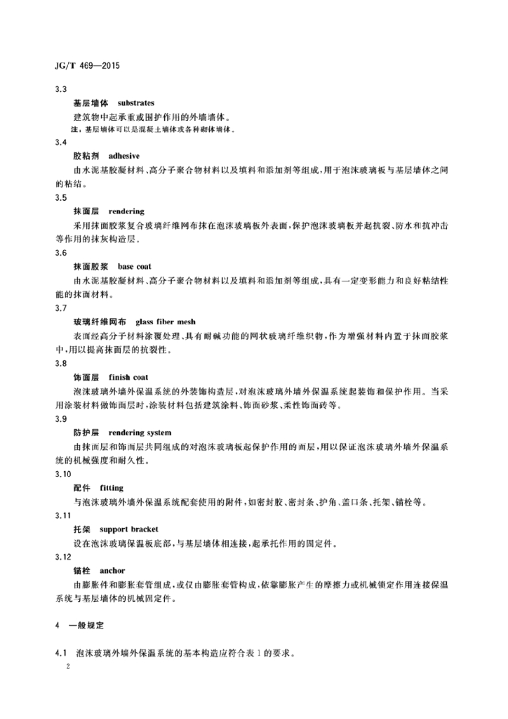 JG/T 469-2015 泡沫玻璃外墙外保温系统材料技术要求