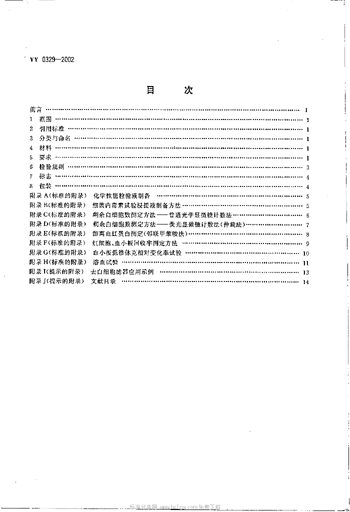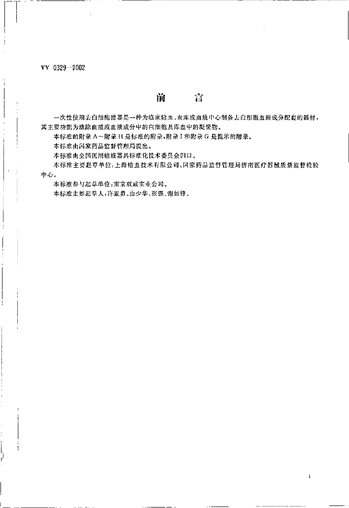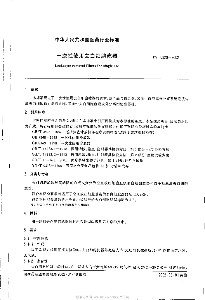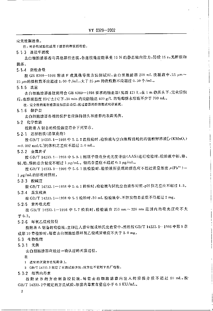 YY 0329-2002 一次性使用去白细胞滤器