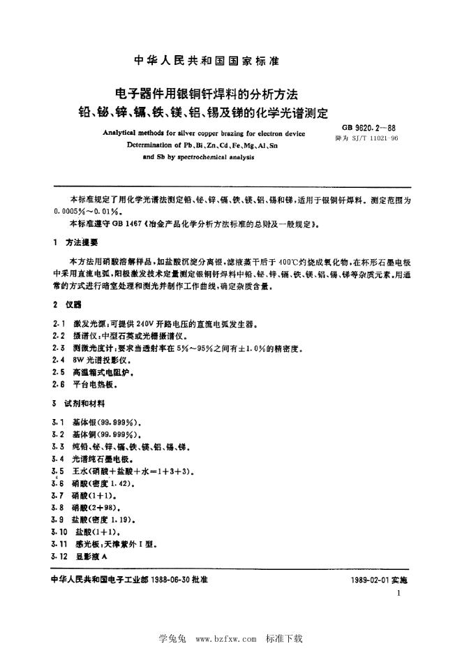 SJ/T 11021-1996 电子器件用银铜钎焊料的分析方法 铅、铋、锌、镉、铁、镁、铝、锡和锑的化学光谱测定