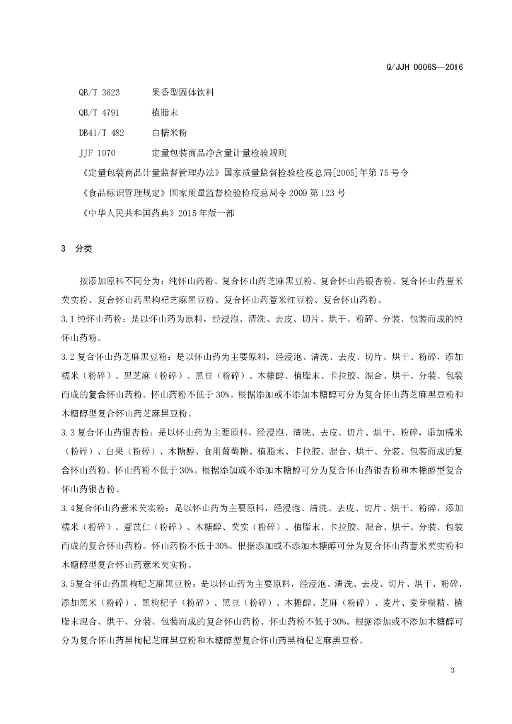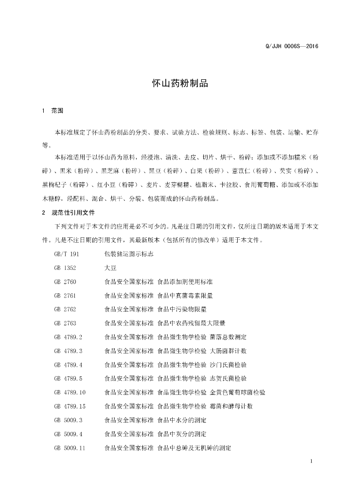Q/JJH 0006S-2016 焦作市健国怀药有限公司 怀山药粉制品