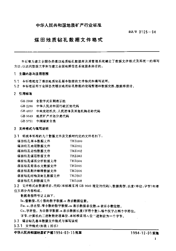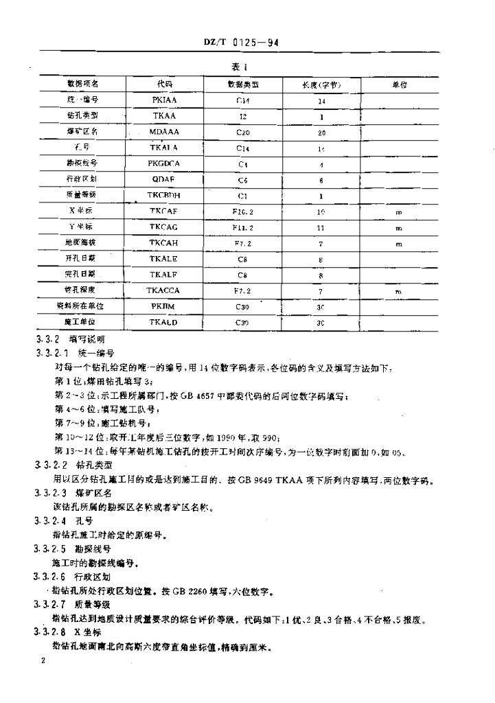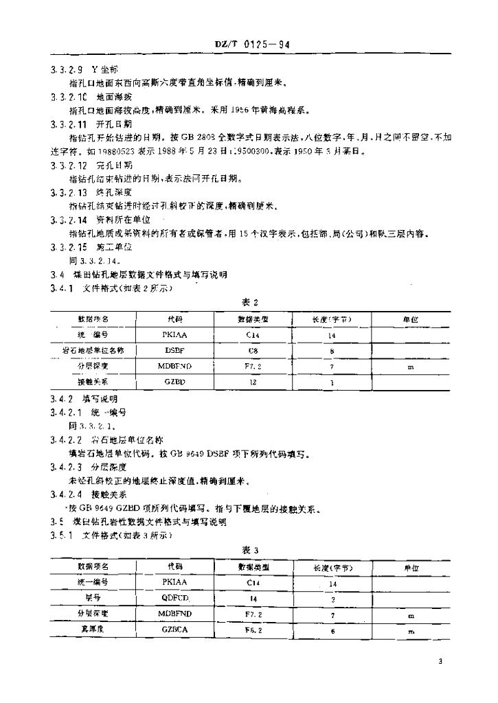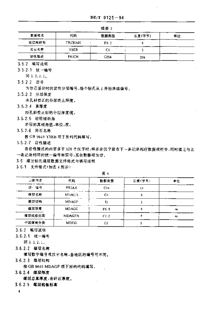 DZ/T 0125-1994 煤田地质钻孔数据文件格式