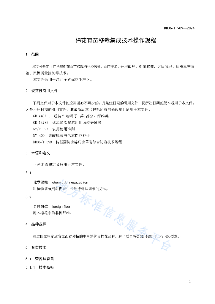 DB36/T 909-2024 棉花育苗移栽集成技术操作规程