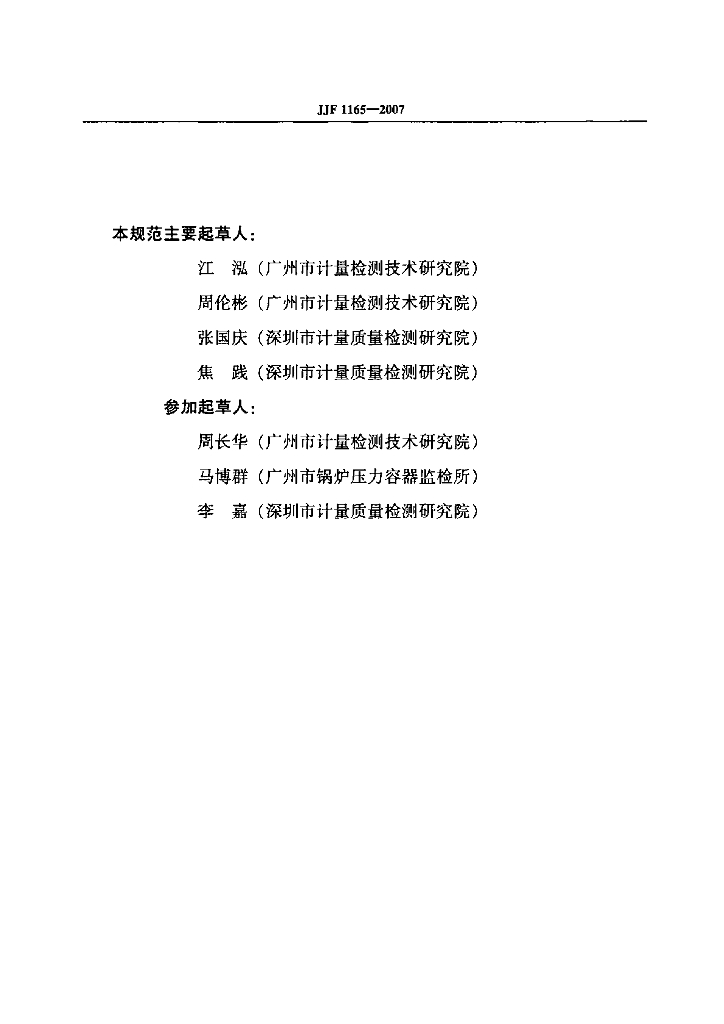 江泓(广州市计量检测技术研究院)、周伦彬(广州市计量检测技术研究院)、张国庆(深圳市计量质量检测研究院)、焦践(深圳市计量质量检测研究院)、周长华(广州市计量检测技术研究院)、马博群(广州市锅炉压力容器监检所)、李嘉(深圳市计量质量检测研究院)