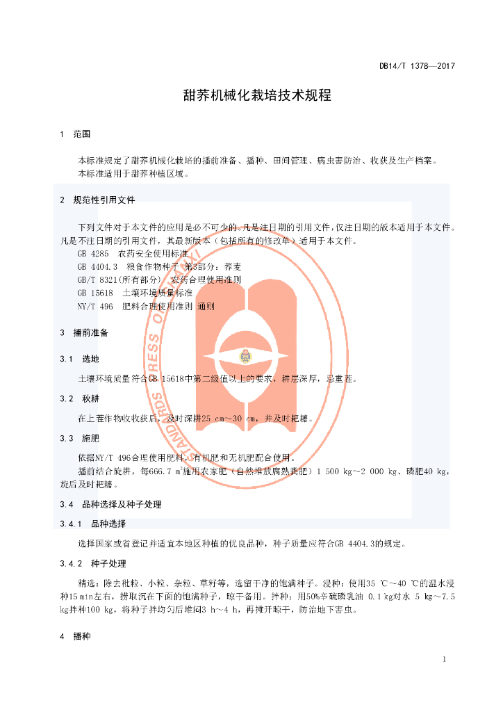 DB14/T 1378-2017 甜荞机械化栽培技术规程