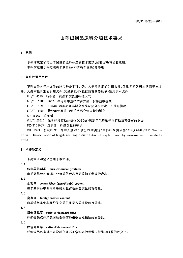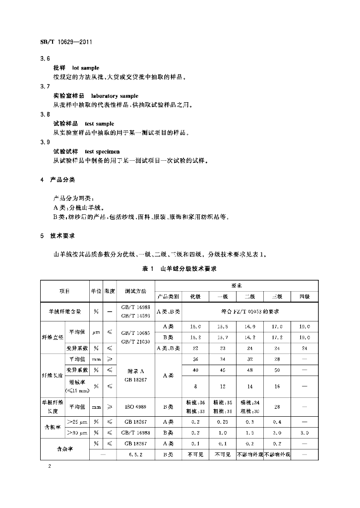 SB/T 10629-2011 山羊绒制品原料分级技术要求