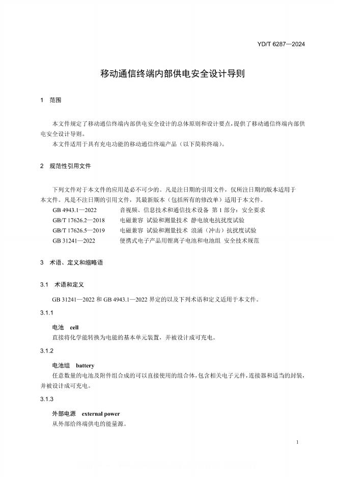 YD/T 6287-2024 移动通信终端内部供电安全设计导则