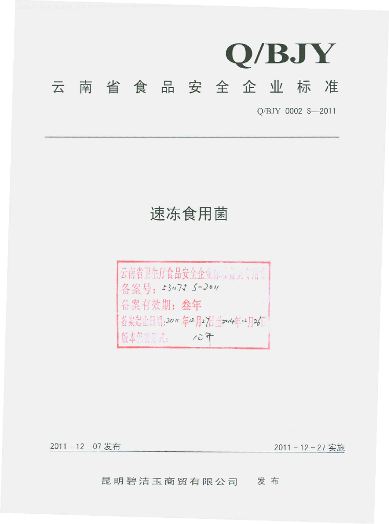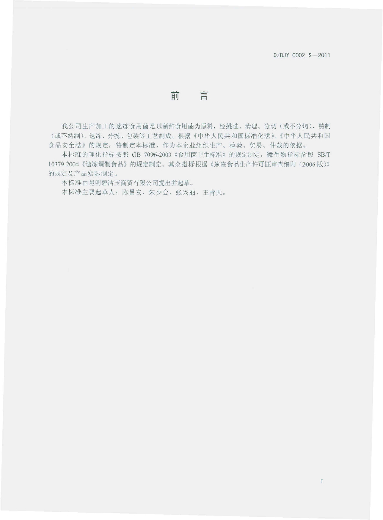 Q/BJY 0002S-2011 速冻食用菌