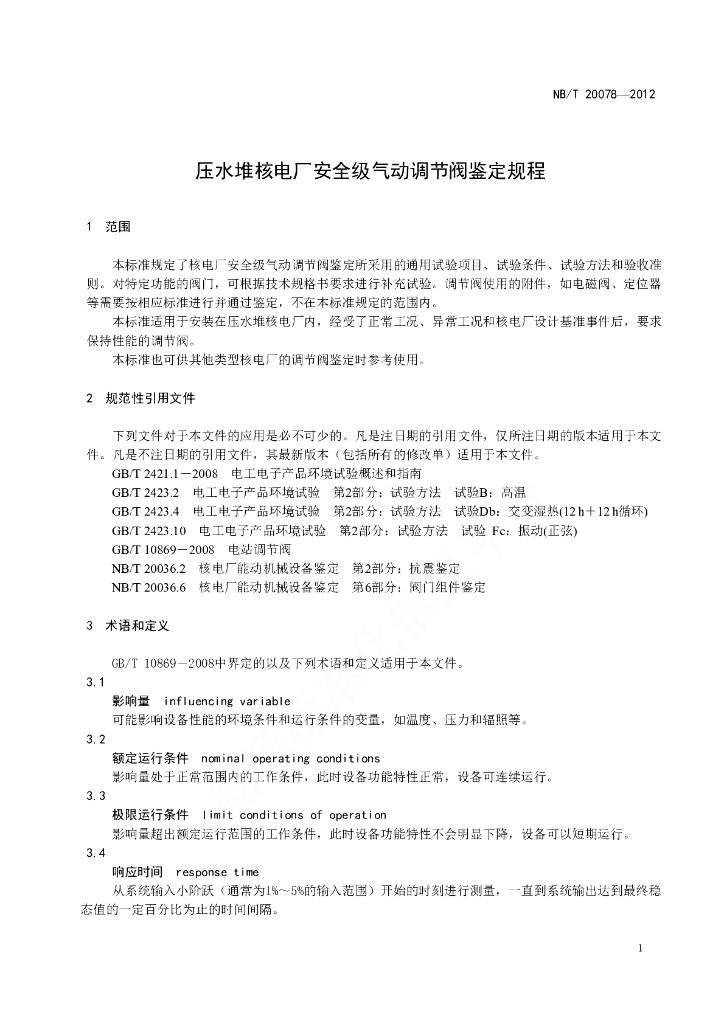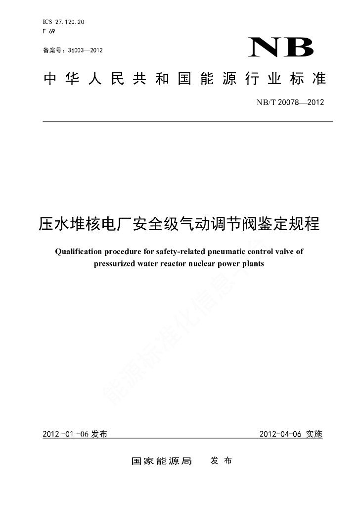 NB/T 20078-2012 压水堆核电厂安全级气动调节阀鉴定规程