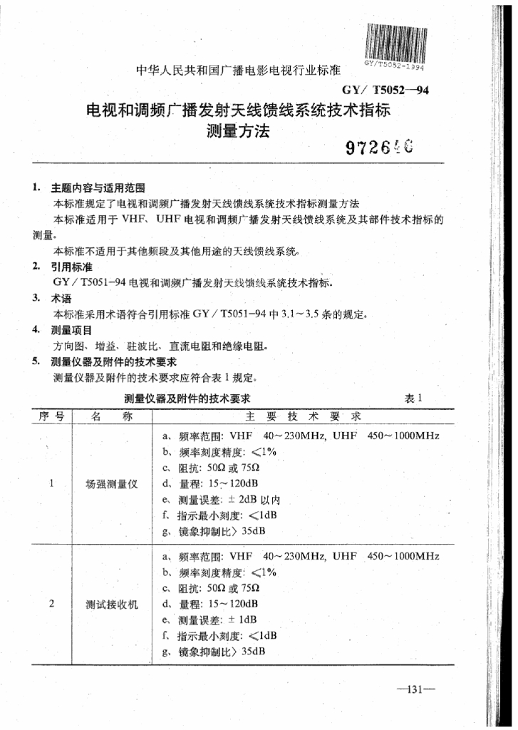 GY/T 5052-1994 电视和调频广播发射天线馈线系统技术指标测量方法